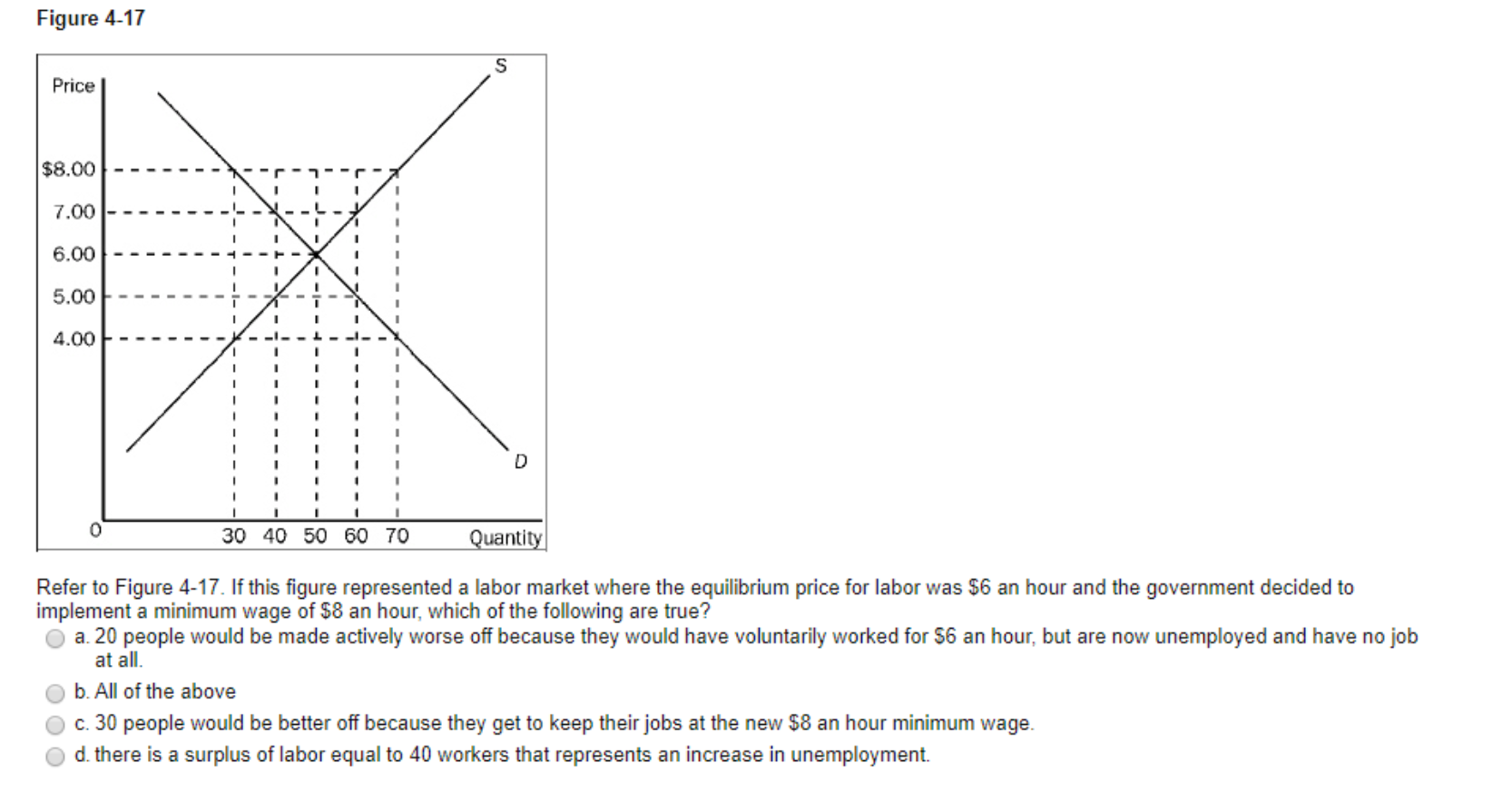 O 30 people would be better off because they get to keep their jobs at the new 8 an hour. Refer to Figure 8-3. At a price of 12 there is a.